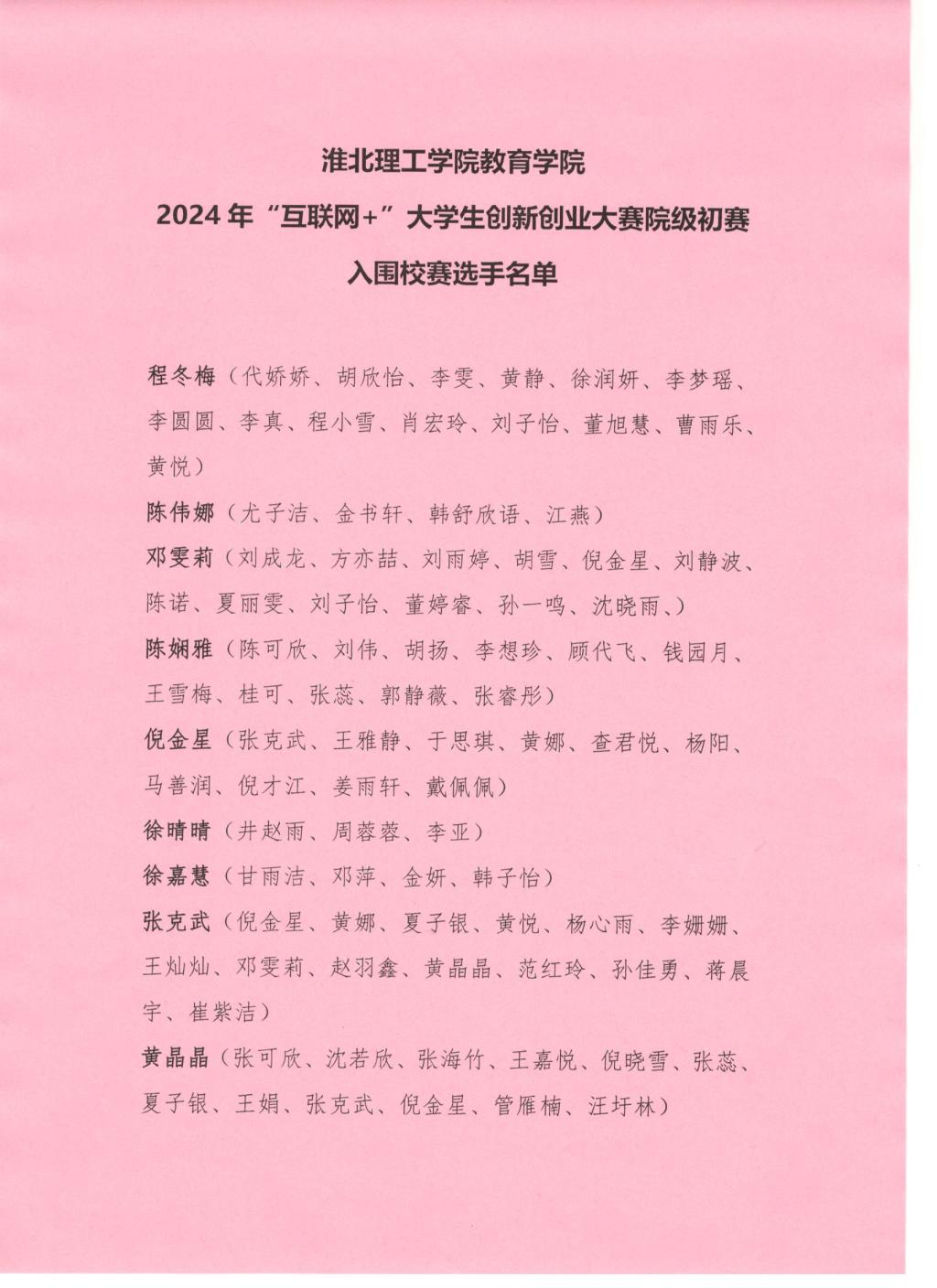 taptap点点体育2024年“互联网+”大学生创新创业大赛院级初赛入围校赛选手名单