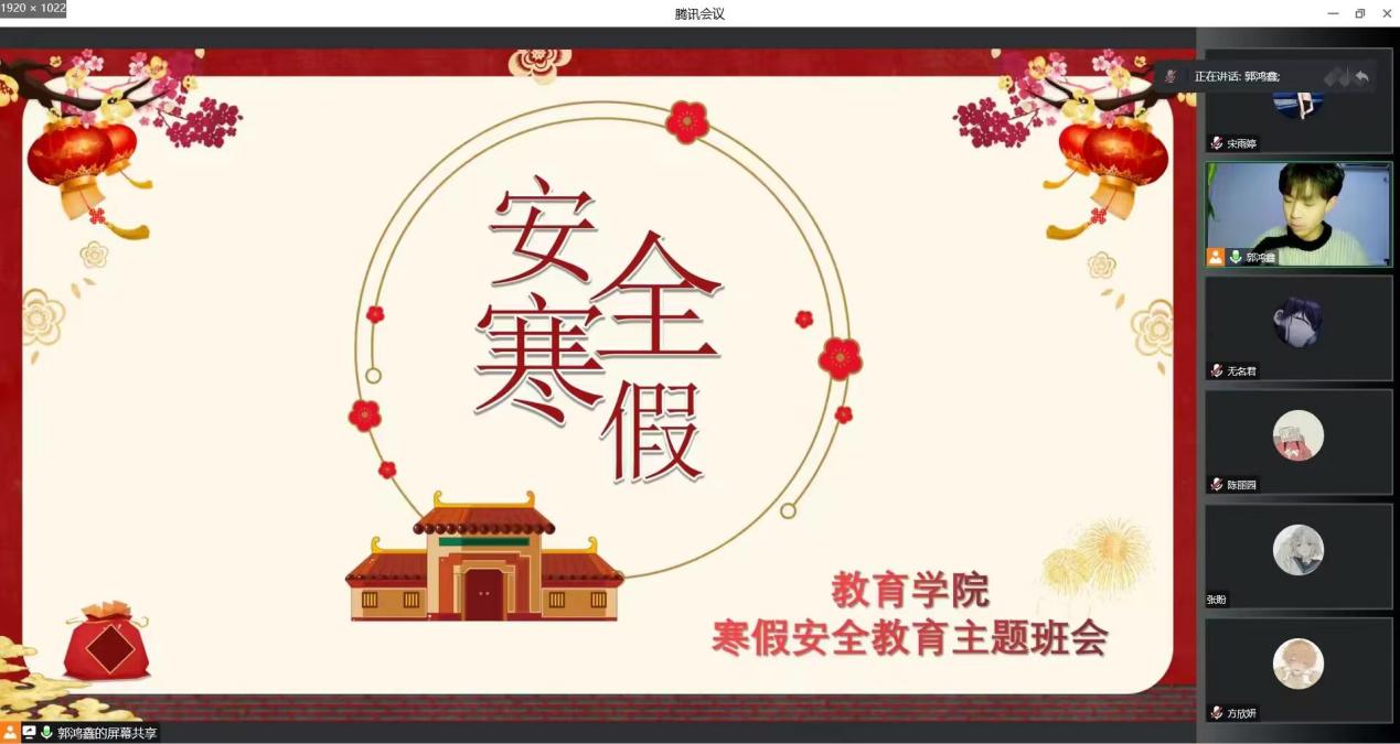 辅导员老师们首先表达了对同学们寒假期间的学习、生活等方面情况的关切,并转达了学校及老师们对同学们新年的美好祝福。会上,辅导员老师对同学们寒假期间的情况进行大致了解,并对大家学习、生活、娱乐和时间管理方面提出了相应建议,提醒同学们在寒假期间做好防火、防盗、防触电等各项安全措施,围绕出行安全、通讯安全、户外安全、疫情防护安全等多方面对学生进行细致入微的宣传教育,同时着重强调谨防电信诈骗,保障自身生命财产安全。