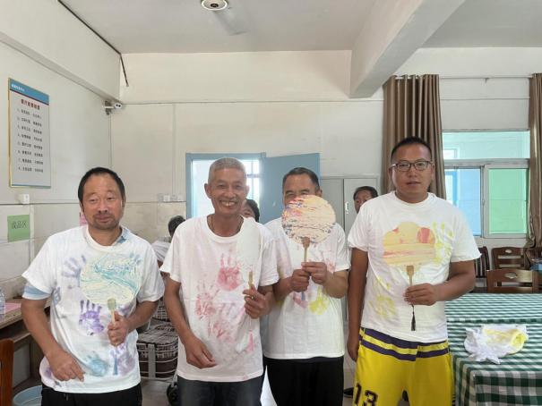 文艺表演结束后,志愿者们又带领老人们开展了“DIYT体恤”和漆扇活动。在老人们的热切期待下,志愿者们耐心指导他们如何根据自己的喜好设计体恤,并在扇面上绘制出独特的图案。在老人们的巧手和志愿者的协助下,每个人都创作出了自己满意的作品,脸上洋溢着自豪和喜悦的笑容。这些活动不仅丰富了老人们的日常生活,还让他们感受到了创造的乐趣和成就感。