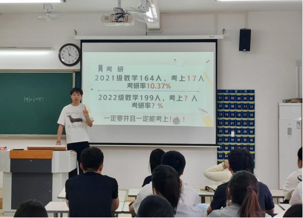 郭鸿鑫老师通过具体数据向同学们介绍了我院2025届数学专业毕业生考研、考公及参军入伍等方面情况:2021级数学专业考研录取17人,学子分别被安徽工程大学、淮北师范大学等高校录取,考研录取率达到10.37%,2名学子投身军营,1名学子录取西部计划,2人成功考取事业单位。郭鸿鑫老师在会议中强调:“这些数字背后是清晰的规划与脚踏实地的努力”。他希望2026届毕业生既要坚定理想,以充足饱满的劲头投入研究生备考工作中,也要脚踏实地,借力学业资源找准个人规划的精准定位。在2025届毕业生出色成绩的基础上,我们要继续拼搏,把就业、考研、征兵工作做实做细,创造属于我们的新成绩。