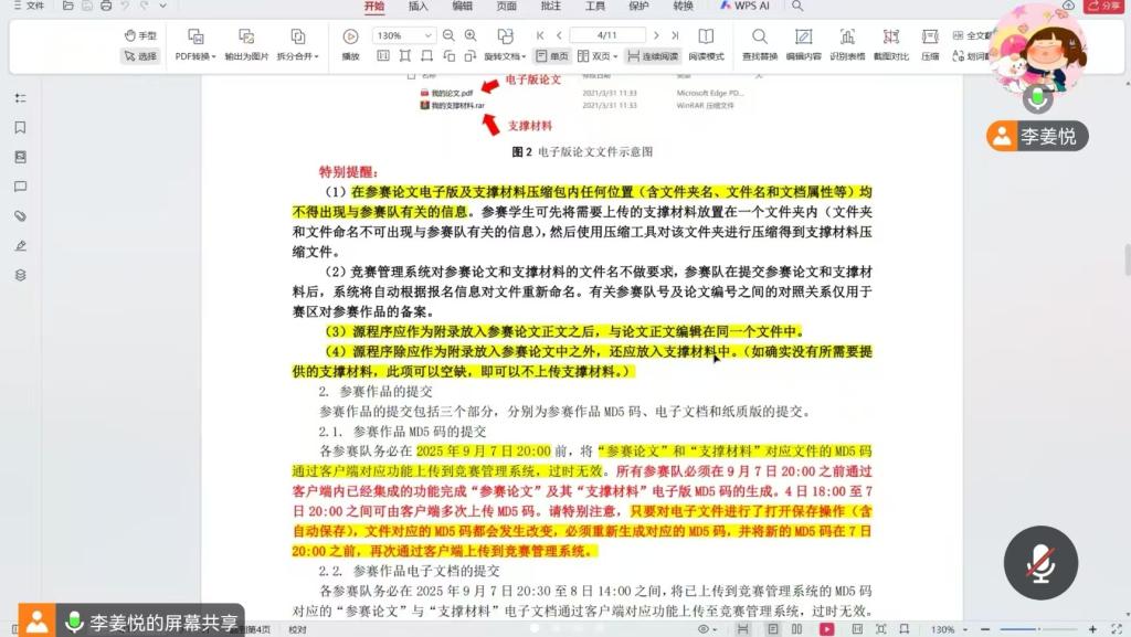 会上,李老师对竞赛规则、作品提交要求及指导教师职责等方面进行了详细说明。首先,李老师提醒所有参赛队伍须在9月1日20时前完成竞赛报名,严格按照竞赛时间要求参赛,确保信息同步。在作品提交环节,李老师指出,参赛队伍需注意在竞赛截止时间内及时提交论文与支撑材料MD5码,以确保论文最终成功提交。