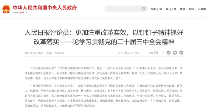 《决定》全面贯彻习近平新时代中国特色社会主义思想,落实党的二十大部署,深刻阐明了进一步全面深化改革的指导思想、总体目标、重大原则举措、根本保证等,是全会精神的“总纲”。