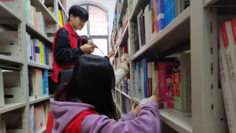 在学校图书馆,同学们在老师的指导下,对照书单,根据编码和书名进行逐一审核,并对图书进行整理,并逐一将图书上架。