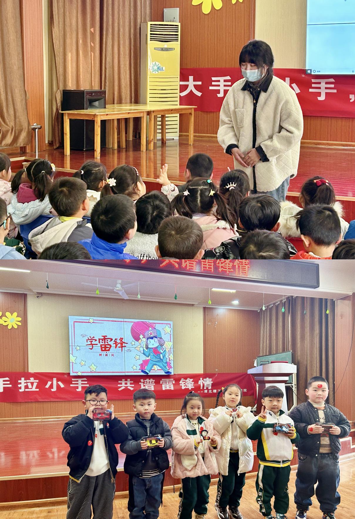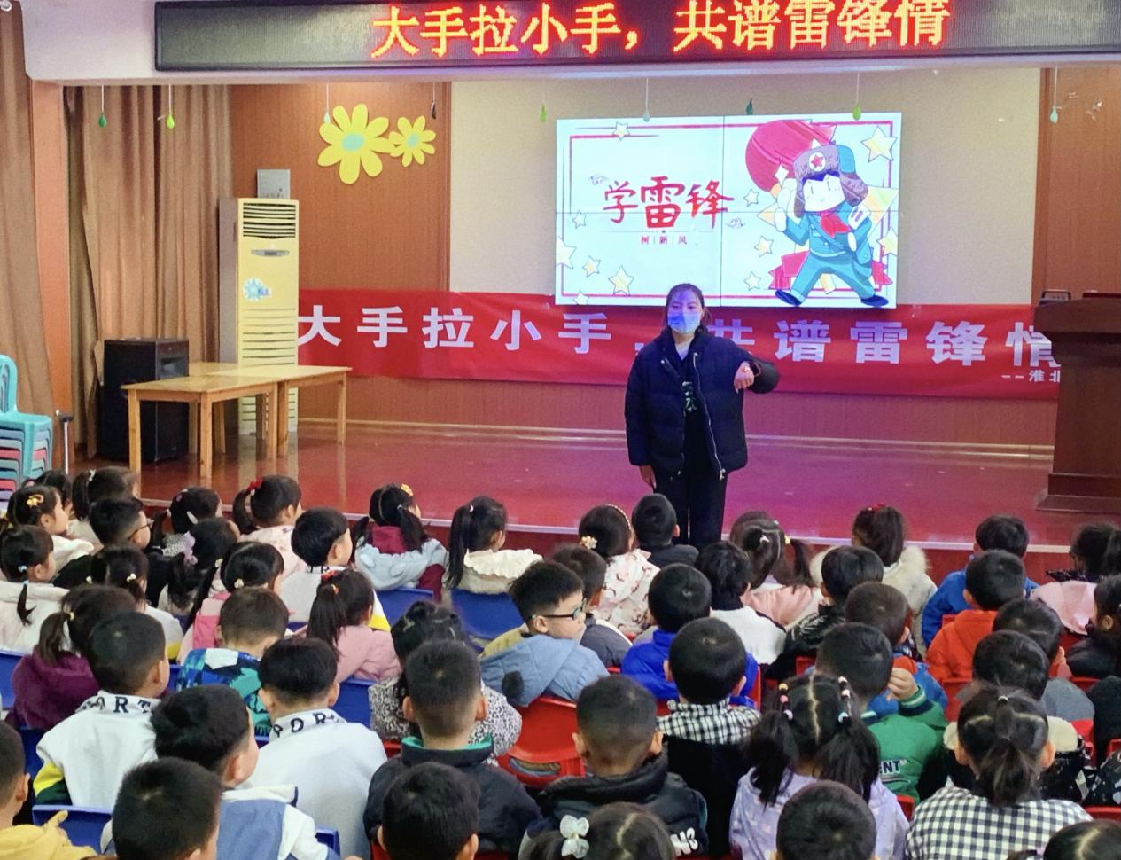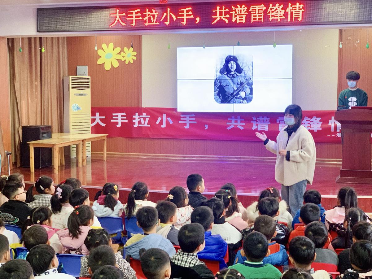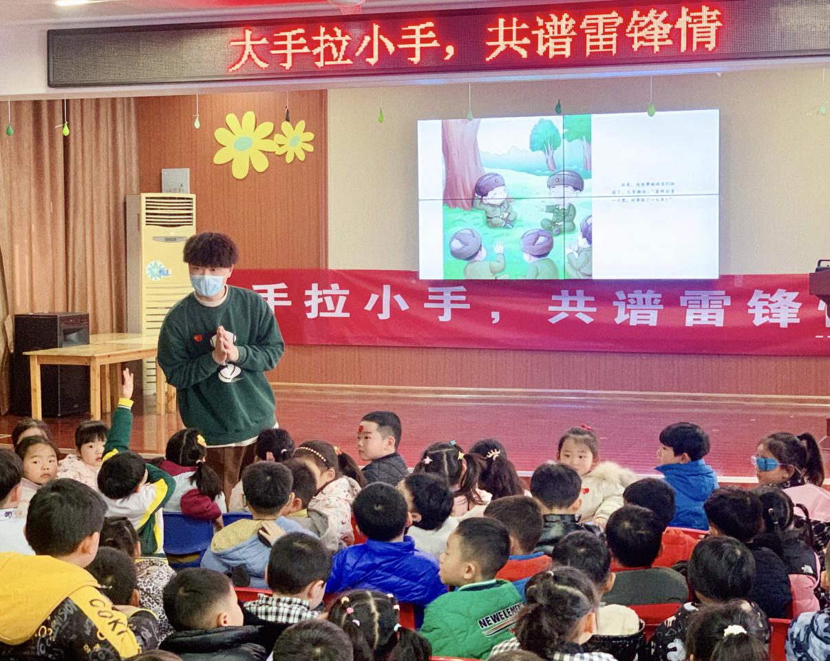 (22级学前专升本1班施国炜为小朋友们讲述雷锋事迹并进行知识问答)