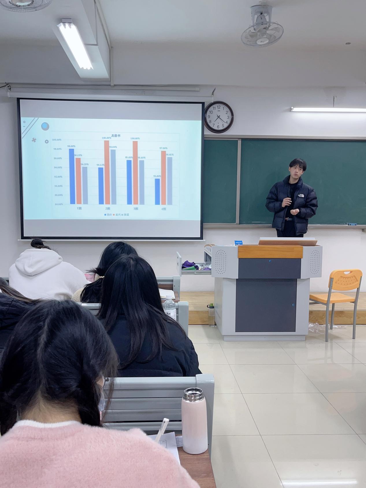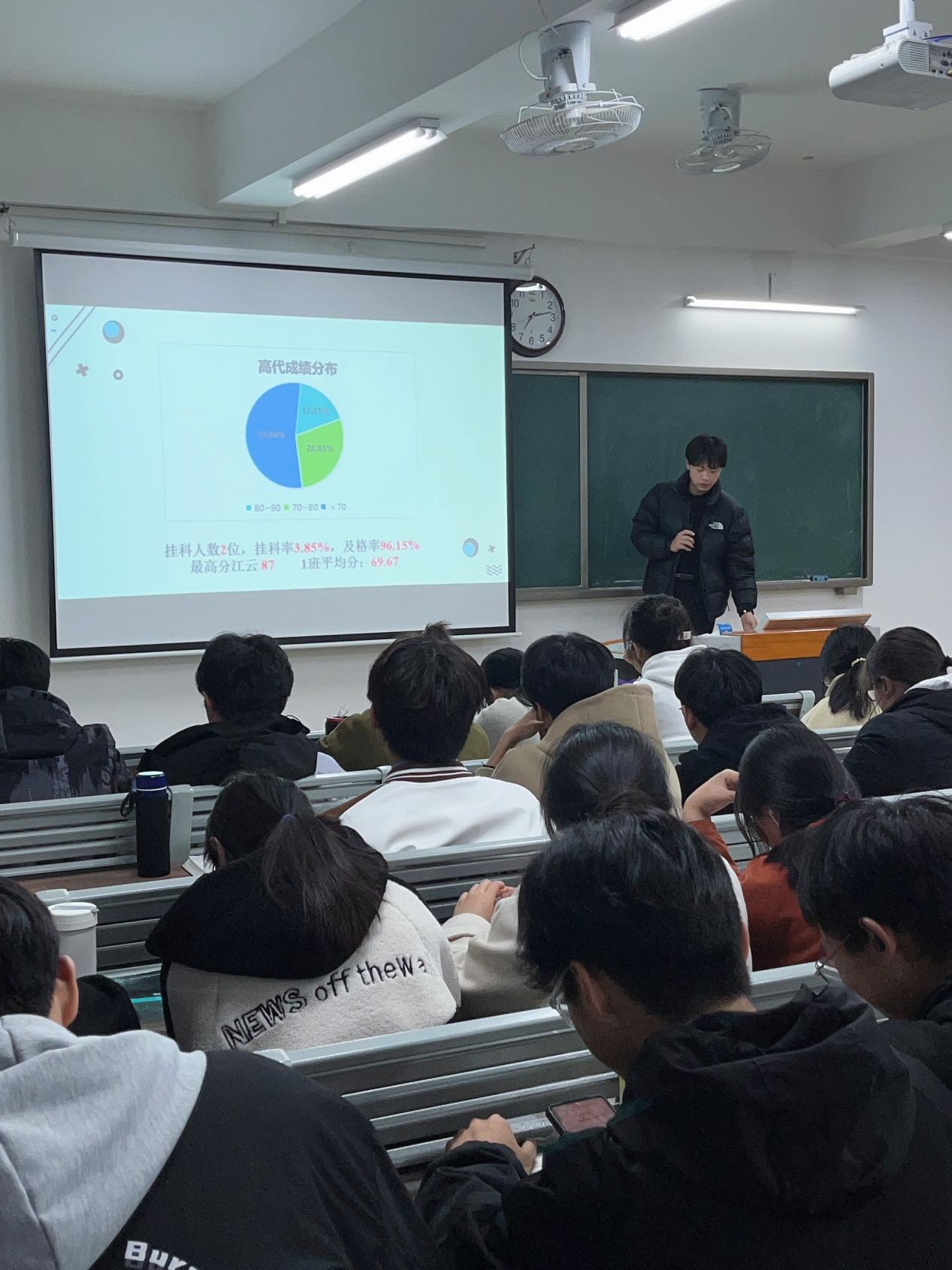 郭鸿鑫老师首先对各班的期末考试成绩进行总结,针对数学分析、高等代数和大学英语三门课程对4个班分别进行及格率、挂科率、平均分、成绩分布等数据分析。并提醒各班同学应保持优势科目的现有水平,注重薄弱科目的查缺补漏,多向优秀的同学学习,并鼓励同学们多与任课老师进行沟通,在班级成立学业互助小组,共同进步。