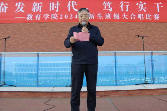 院长王家云为比赛致辞。他说,新生大合唱是我院最重要的集体活动之一,从2021年学校创办以来开始举办,至今已经是第四届,举办大合唱就是要凝聚同学们的爱国情、熔铸同学们的淮理心、点燃同学们的奋斗志、汇聚同学们的勤奋力、助力同学们的的明天梦,“踔厉奋发新时代,笃行实干谱新篇”不仅是本次活动的主题,也是对每位同学的勉励和期望,希望同学们用歌声展现爱国主义情怀和中华儿女的自信自强、守正创新的精神气象。