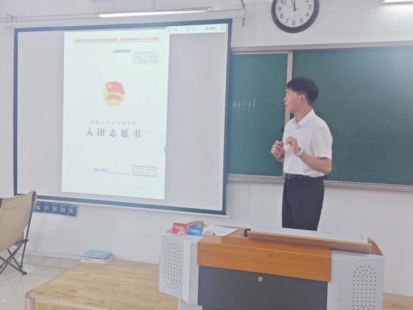 会议重点围绕《入团志愿书》填写规范展开。郭鸿鑫老师结合模板,逐项讲解填写要求,强调志愿书是团员政治身份的重要档案,需确保内容真实、格式规范。他说团员青年应深刻理解“思想入团”的内涵,要求大家时刻牢记共青团员的身份,勤奋学习,努力工作,在学习生活和班风建设中发挥模范作用。